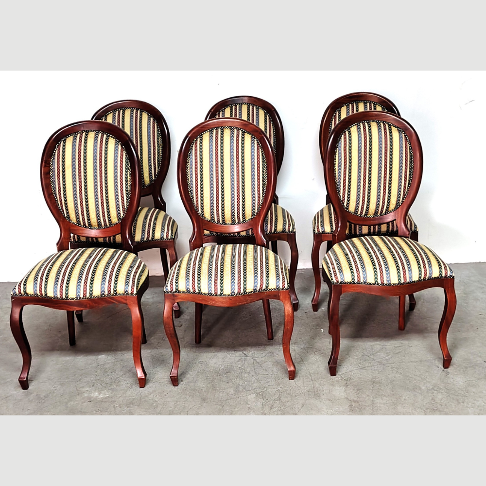 Conjunto 6 Cadeiras Provençais Antiga Estilo Medalhao Madeira Mogno Tecido Listrado